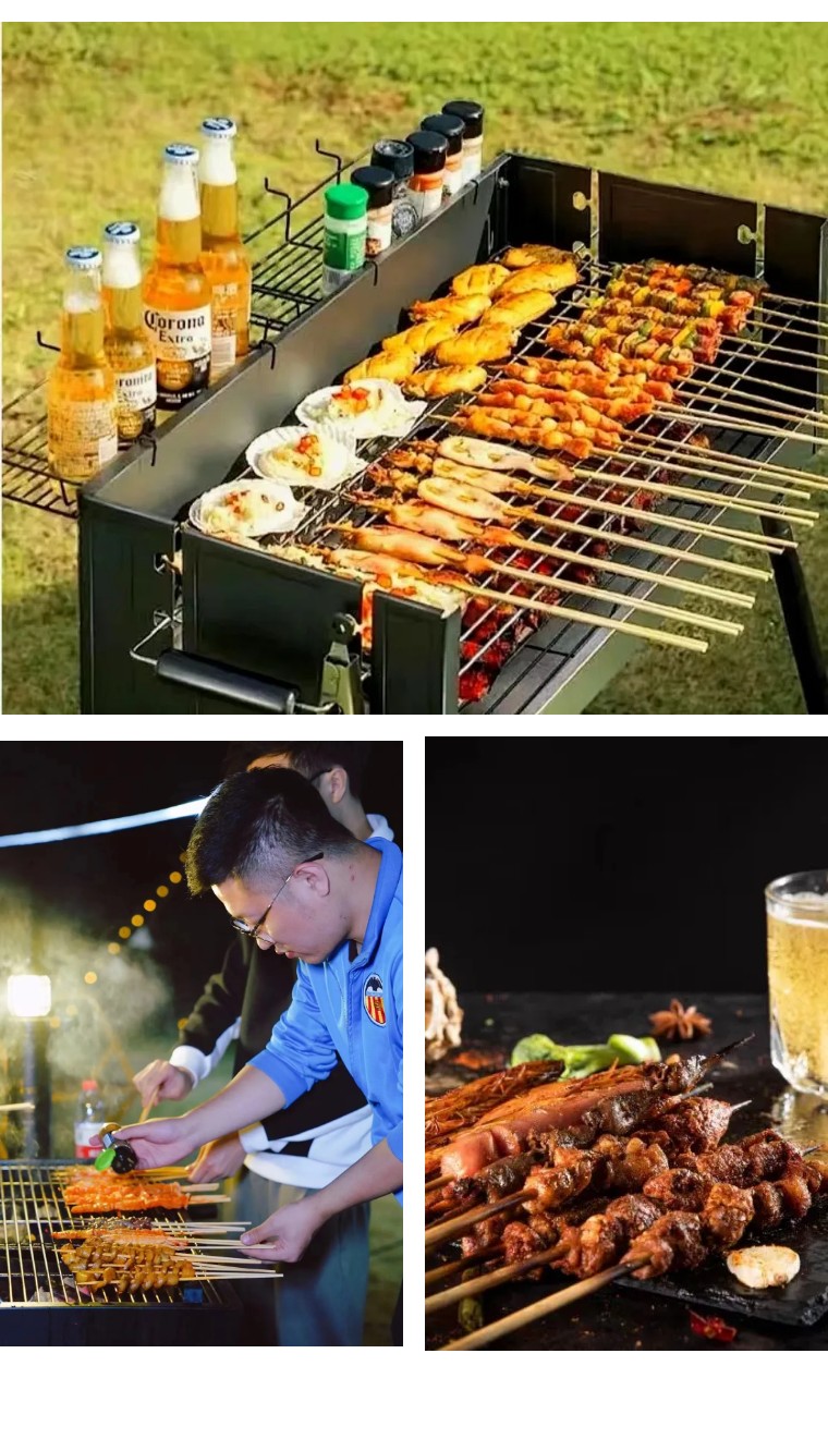食材类:(包括但不限于):新西兰羊肉串、牛肉串、芝香肉串、秋刀鱼、鱿鱼须串、基围虾、奥尔良鸡中翅、奥尔良去骨整鸡腿 、五花肉串、鸡皮、田螺肉、香肠、面筋、年糕、馒头串 、茄子 、韭黄、金针菇、娃娃菜等时令蔬菜;