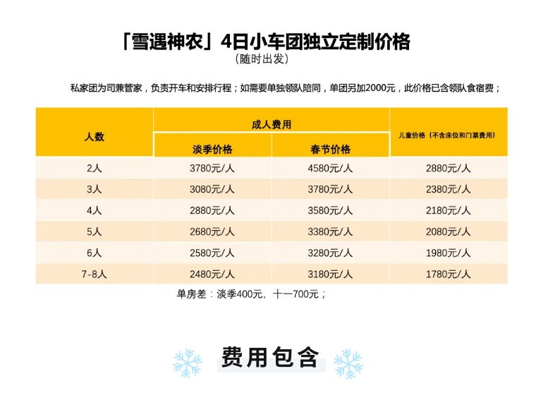 3.个性化消费,比如神农架滑雪雪服租赁35-100元一套、头盔20元一个、滑雪手套16元一个、寄存柜25元一个、滑雪眼镜30元一副等,另外不含滑雪专业教练费用(根据人数定价);我们滑雪包含的是双板或单板全天滑雪,如果需要中途换板,多出来费用自行支付;