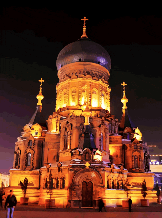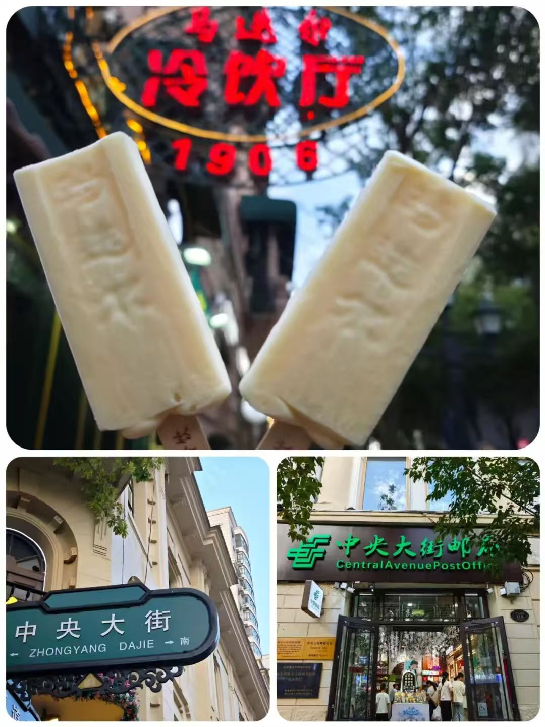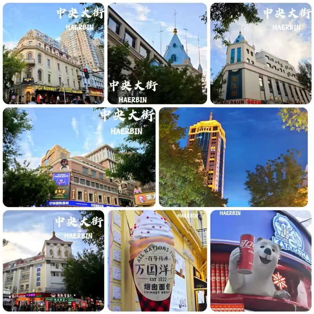 在中央大街中段的一座著名建筑马迭尔宾馆附近,