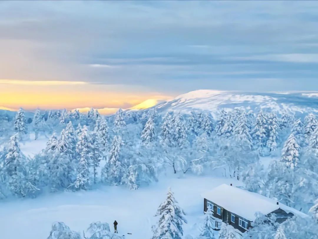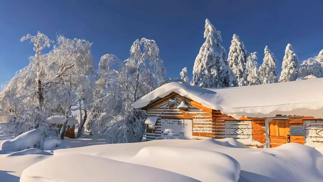 屋顶上厚厚的积雪如同奶油蛋糕上的糖霜,