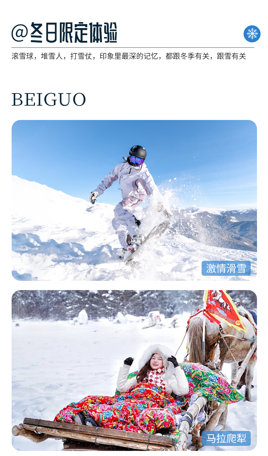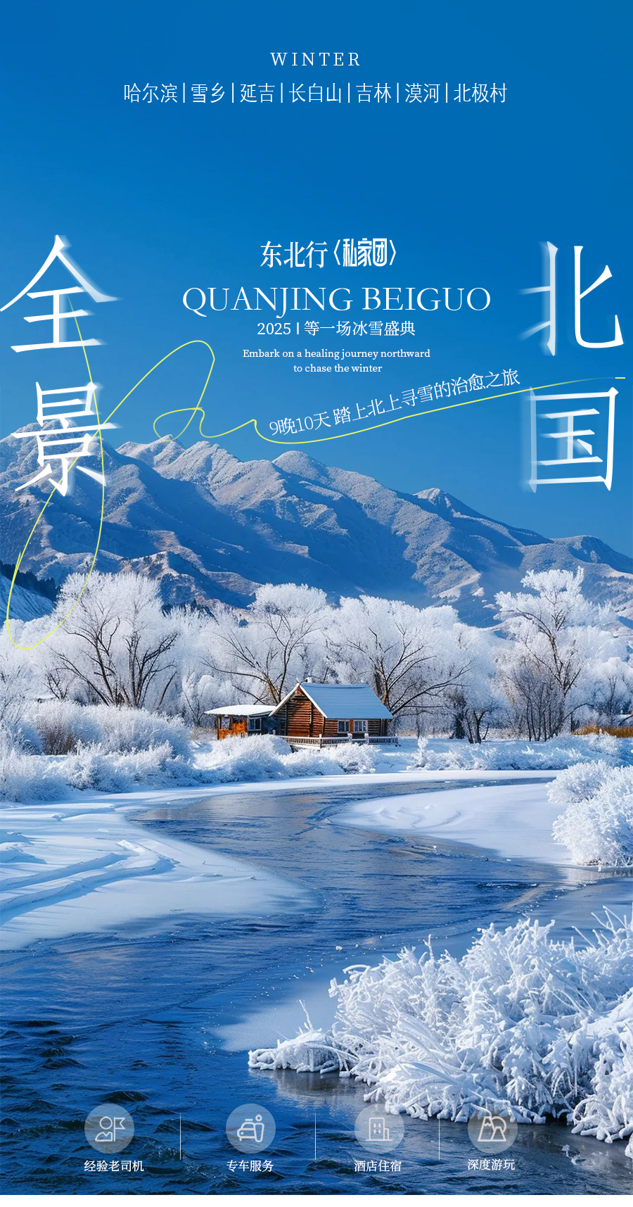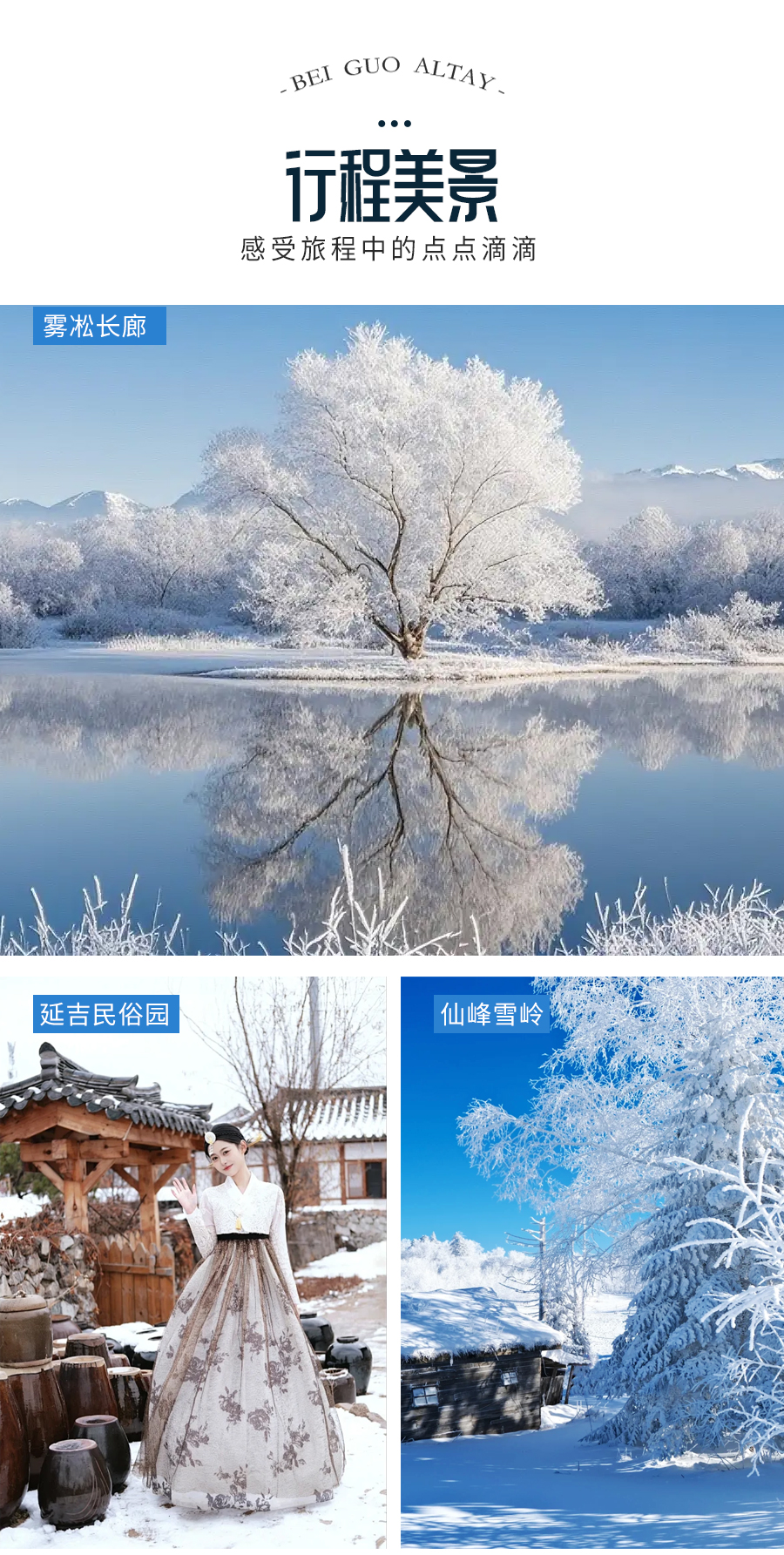 4、门票:雪岭/老里克湖门票、秘境穿越门票、镜泊湖冬捕、滑雪门票(包含雪鞋雪板雪杖使用)、雪乡门票+往返环保车、朝鲜民俗园门票、长白山门票+往返环保车+倒站车、龙江第一湾门票、圣诞村门票、北极村门票、鄂温克驯鹿园门票;