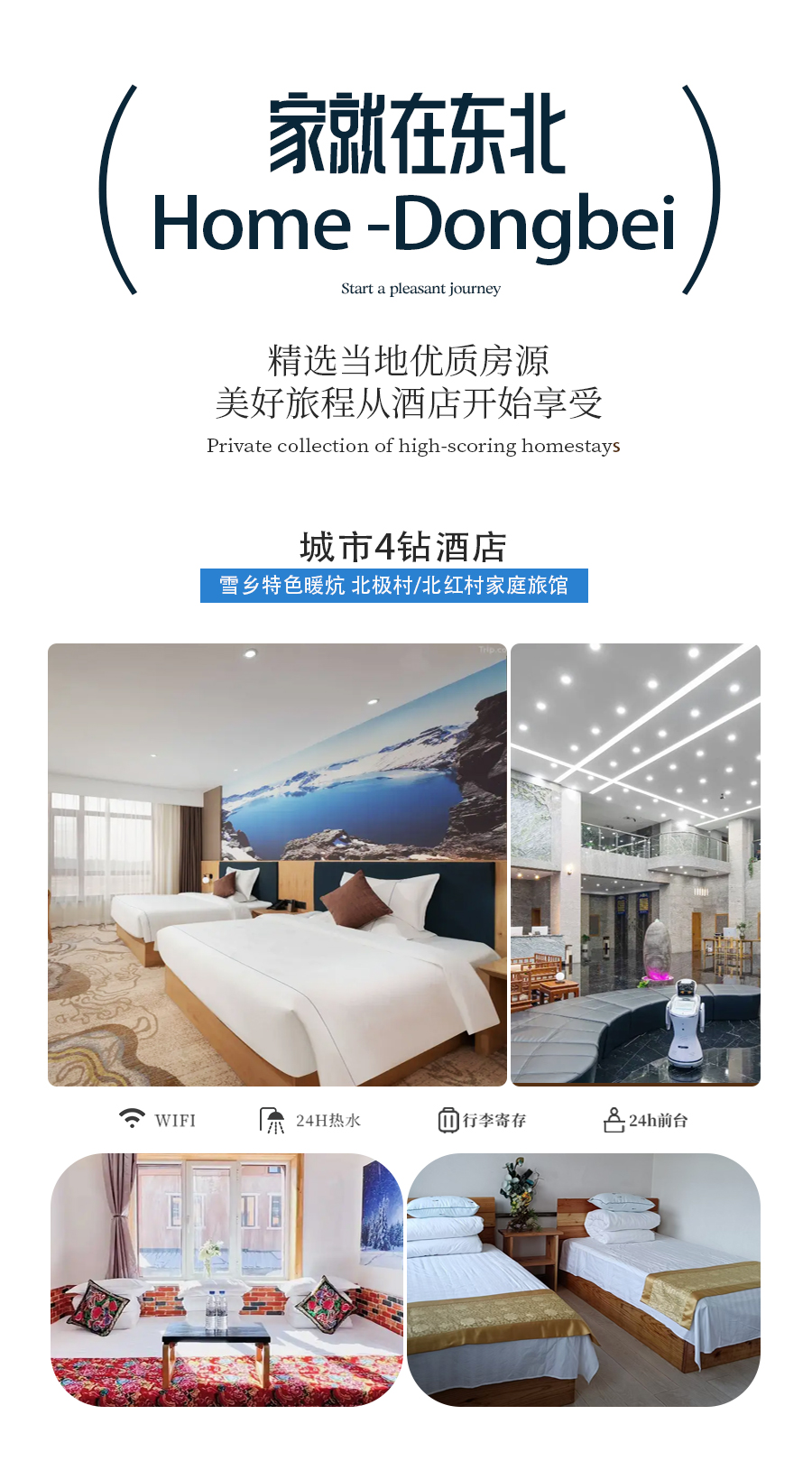 备注:钻级标准参考携程钻级标准,东北经济发展较差,酒店已经是我们精心挑选的,但是和大城市同级别酒店相比各方面略差一些,敬请您谅解;