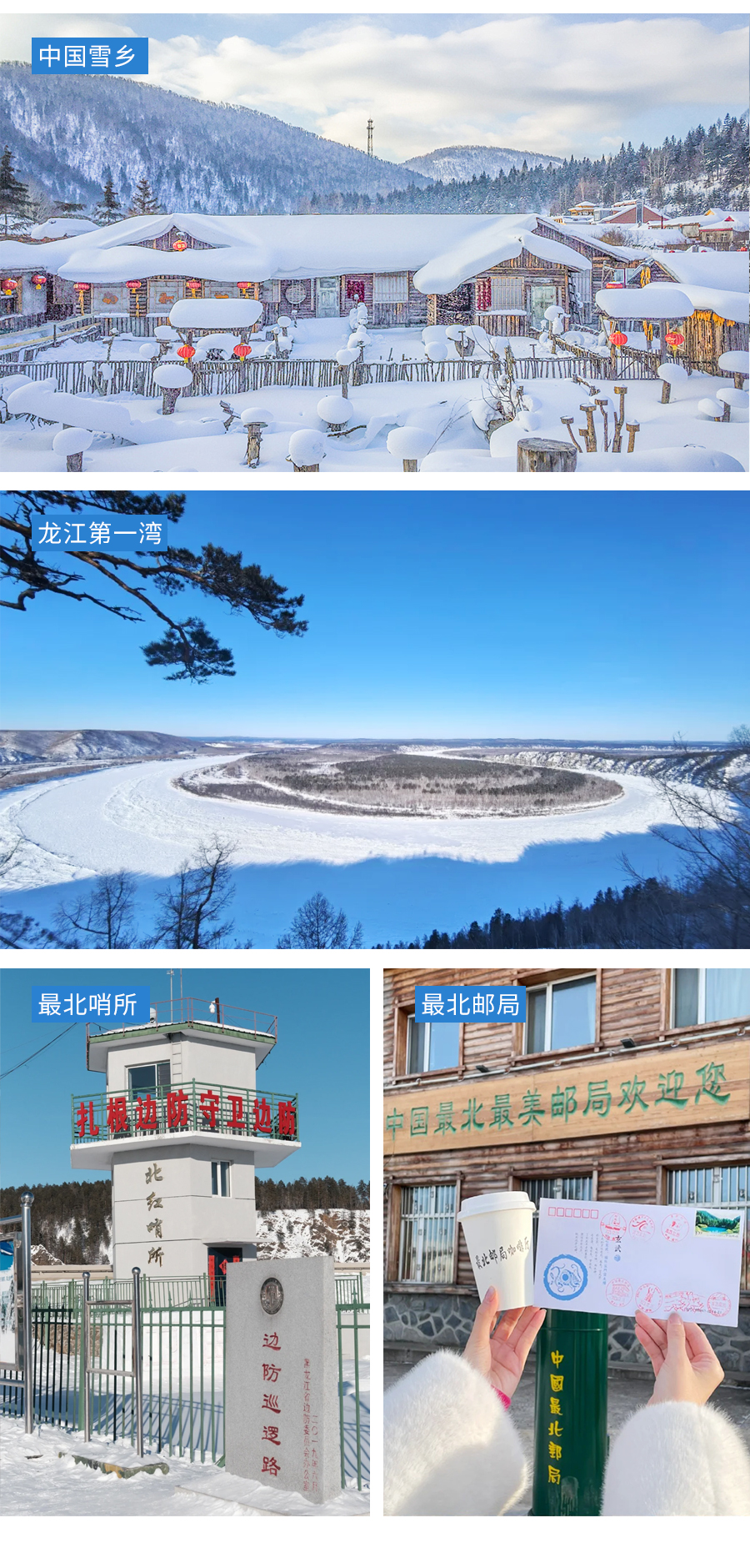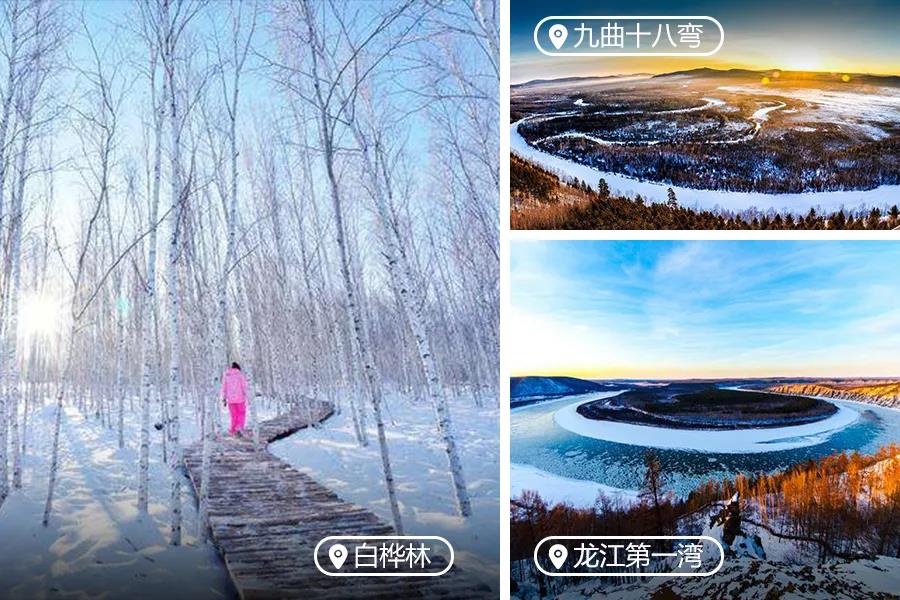 08 : 00一觉醒来前往【63大桥】也叫额木尔河大桥,冬天桥下的河完全冰冻,不仅能走人,也是打雪仗、拍网红照片的好地方。【龙江第一湾】,登上观景平台上远眺龙江第一湾,河流弯道呈Ω形状,越是向上,那一湾河道就越来越明显起来。站在顶处望去,俯瞰着对岸的俄罗斯森林,感到一种神秘而诱人的错觉;没有汹涌澎湃,没有浊浪滔天,这里只有属于你和它的故事。接下来一定要去的就是【乌苏里浅滩】—真正中国最北点,也叫卡伦小镇,紧挨着中俄界河黑龙江,冬季更是雪卧原野,一片银白世界,大自然的鬼斧神工,造就了一个冰雪王国,童话世界
